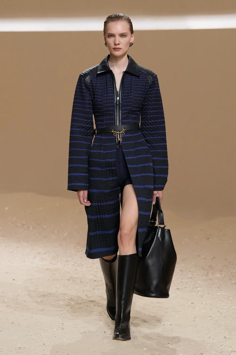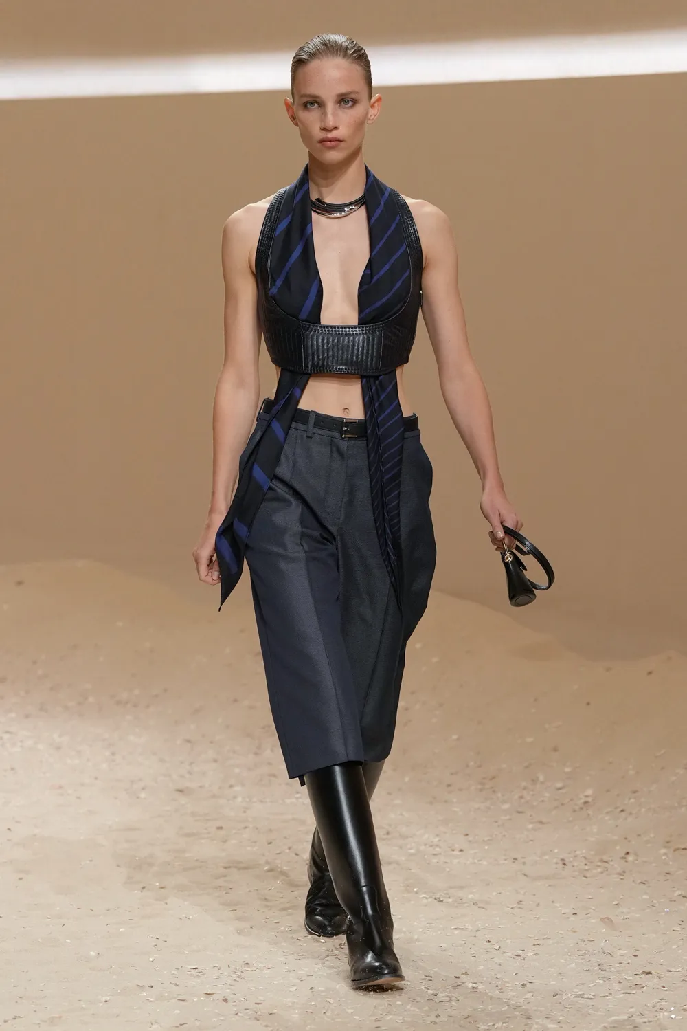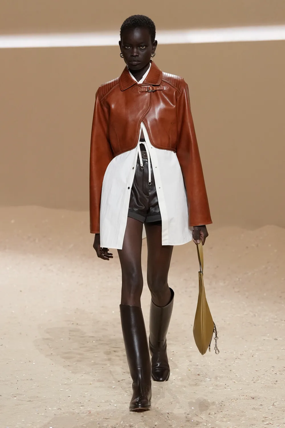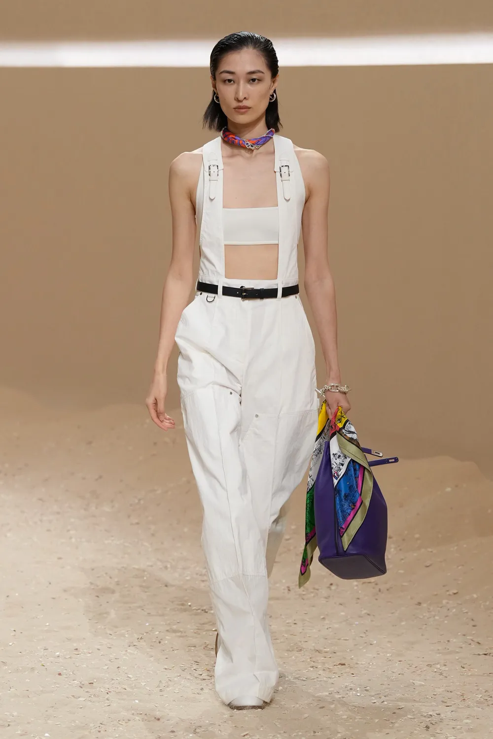 爱马仕 2026 春夏女装系列由爱马仕女装艺术总监 Nadège Vanhée 女士打造,其优雅在于游刃有余地呈现叠穿、相互呼应的穿搭。真丝方巾可随性叠化为上衣,由皮革胸衣束裹,或成为点睛颈饰。绗缝连衣裙承袭束身衣结构,与工装背带裤共构一幅流动景致。一切看似信手拈来,于随性中见巧思,在律动中定风格。