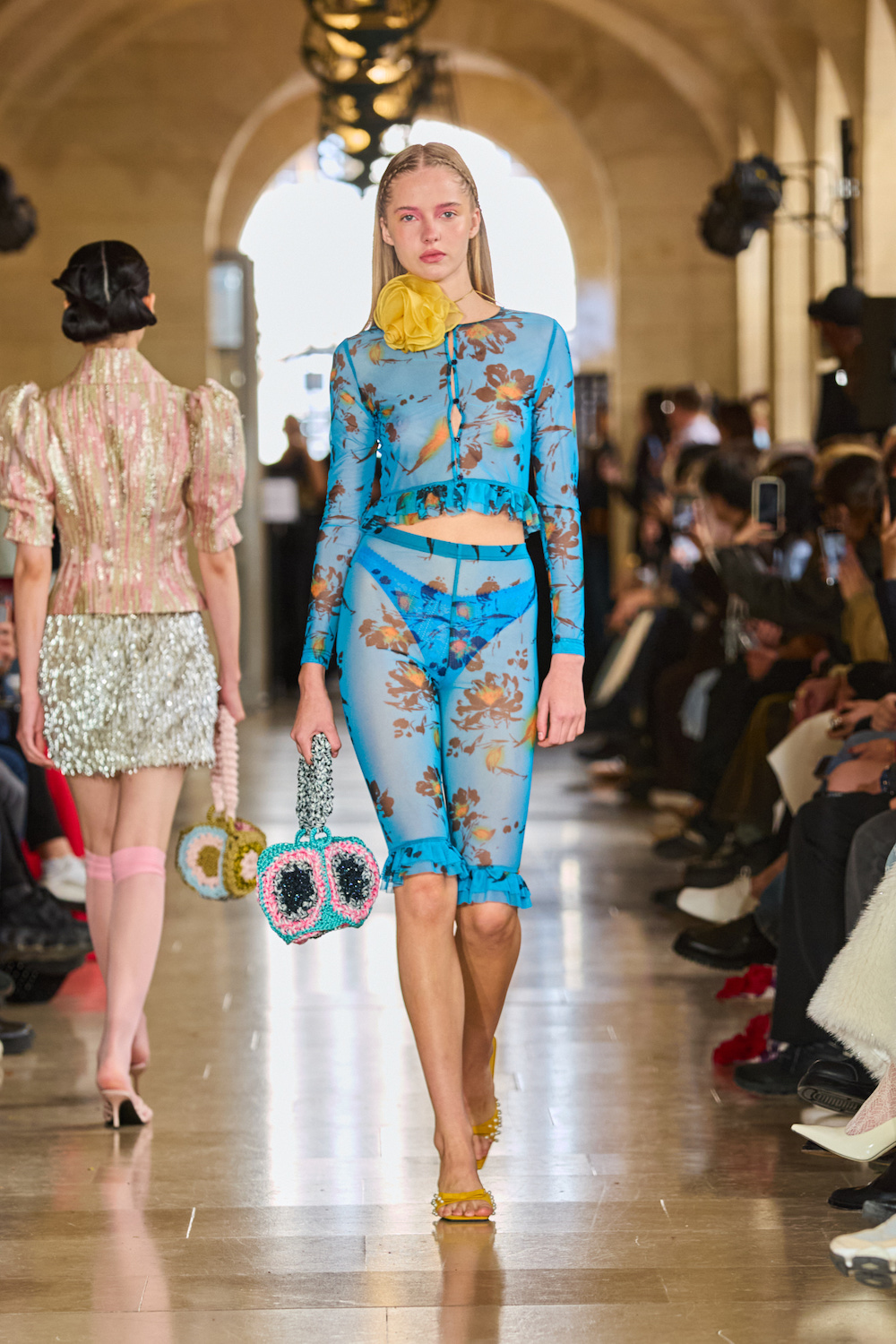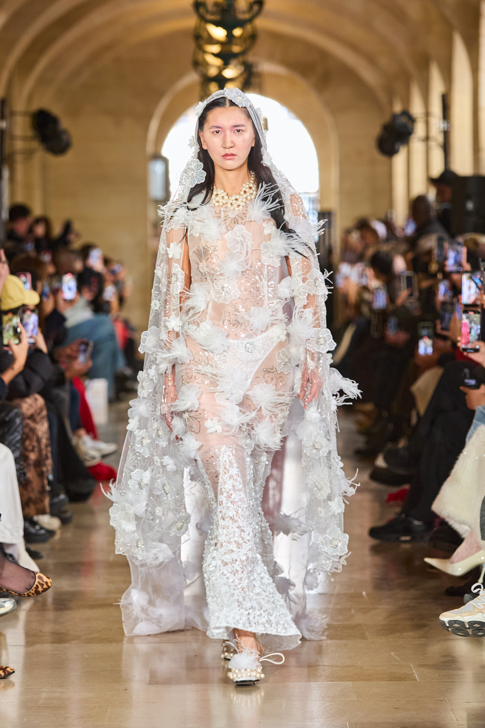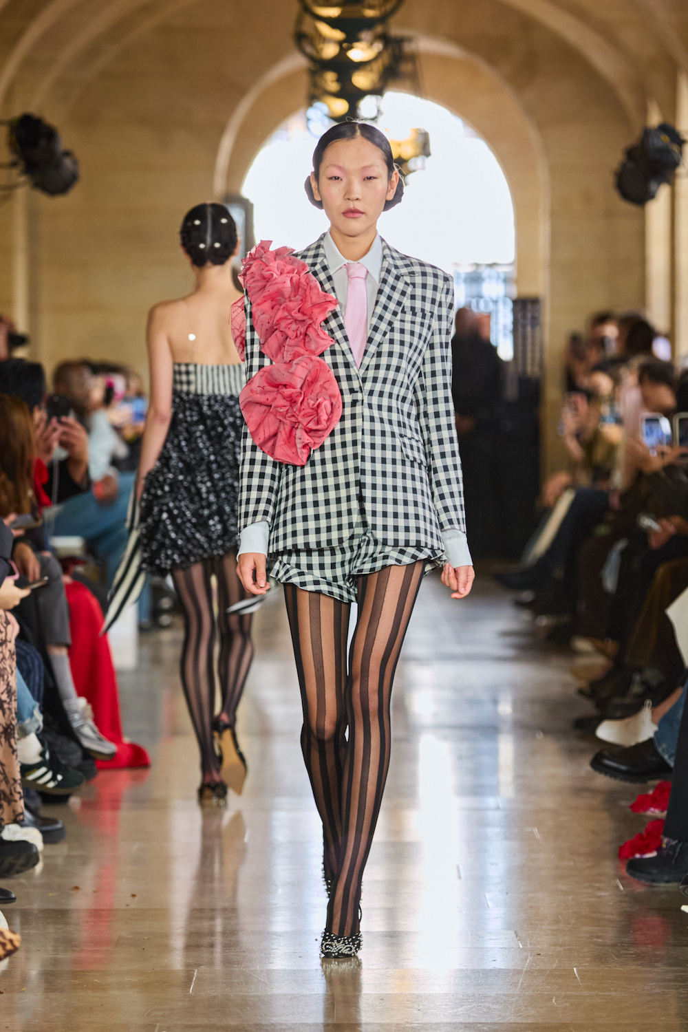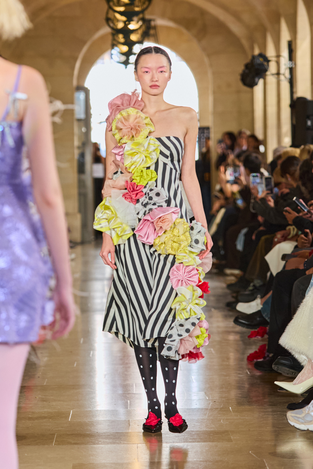 裘淑婷 Shuting Qiu 2026 春夏系列以《以柔破界》为主题,是一场以柔克刚的宣言,也是对当代浪漫的一次重释。在系列中,蝴蝶结肆意绽放,立体花卉生机盎然,戏剧性的荷叶边随步伐律动,黑白刺绣在浪漫与张力之间游走。这些曾象征少女的装饰,如今成为女性自信的符号。
