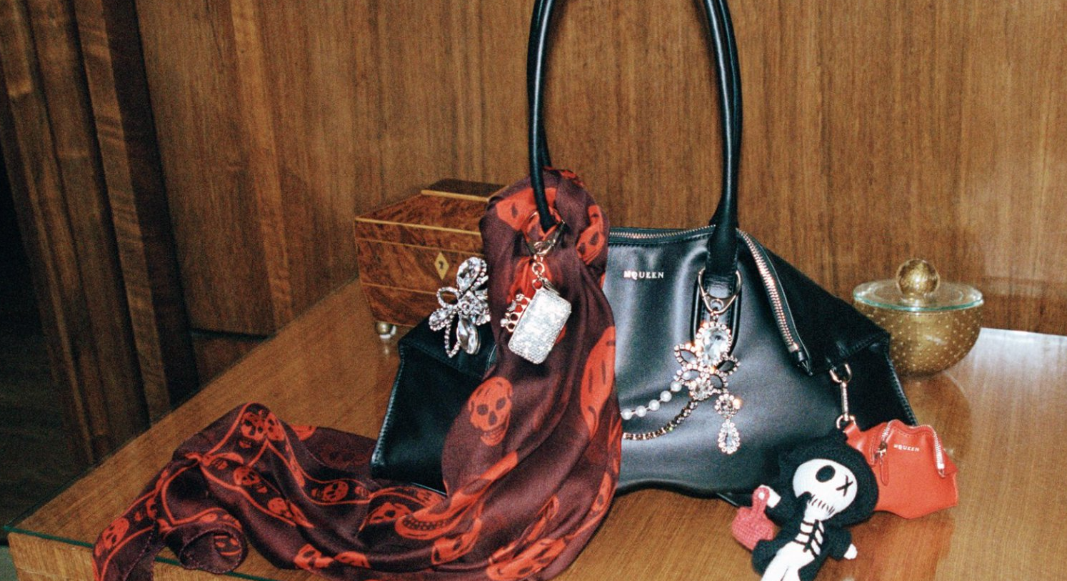品牌的颠覆精神,在材质的对比中强烈迸发:柔软的经典‘MacQueen’格纹呢料,与缀满银色铆钉的皮革大胆碰撞;可自由搭配玩味钩织挂饰、璀璨水晶链以及标志性骷髅头印花丝巾,打造极具辨识度的个性化风格。