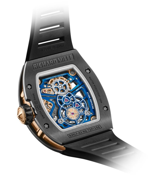 RM 17-02 ATZ 白陶瓷款,为钛合金陀飞轮机芯提供了一个纯净无瑕的舞台,使其跃动的能量得以淋漓展现。表圈所采用的陶瓷质地细腻柔滑,其抛光倒角勾勒出流畅的轮廓,与五级钛合金表壳中层的精致质感相得益彰,延续出一种雅致的单色调美感。从陶瓷的深邃黑暗中,金的温润光泽徐徐浮现。另一款 RM 17-02 TZP 黑陶瓷款的表圈呈现出力量与深度,与 5N 红金中层的温暖光辉相结合,衬托出表壳的优雅曲线--每一处细节皆经深思熟虑。