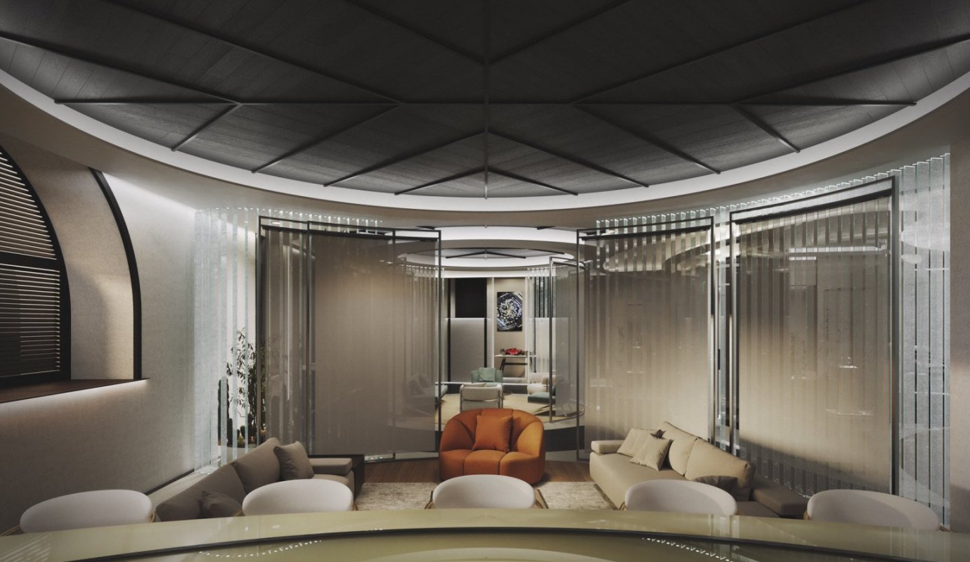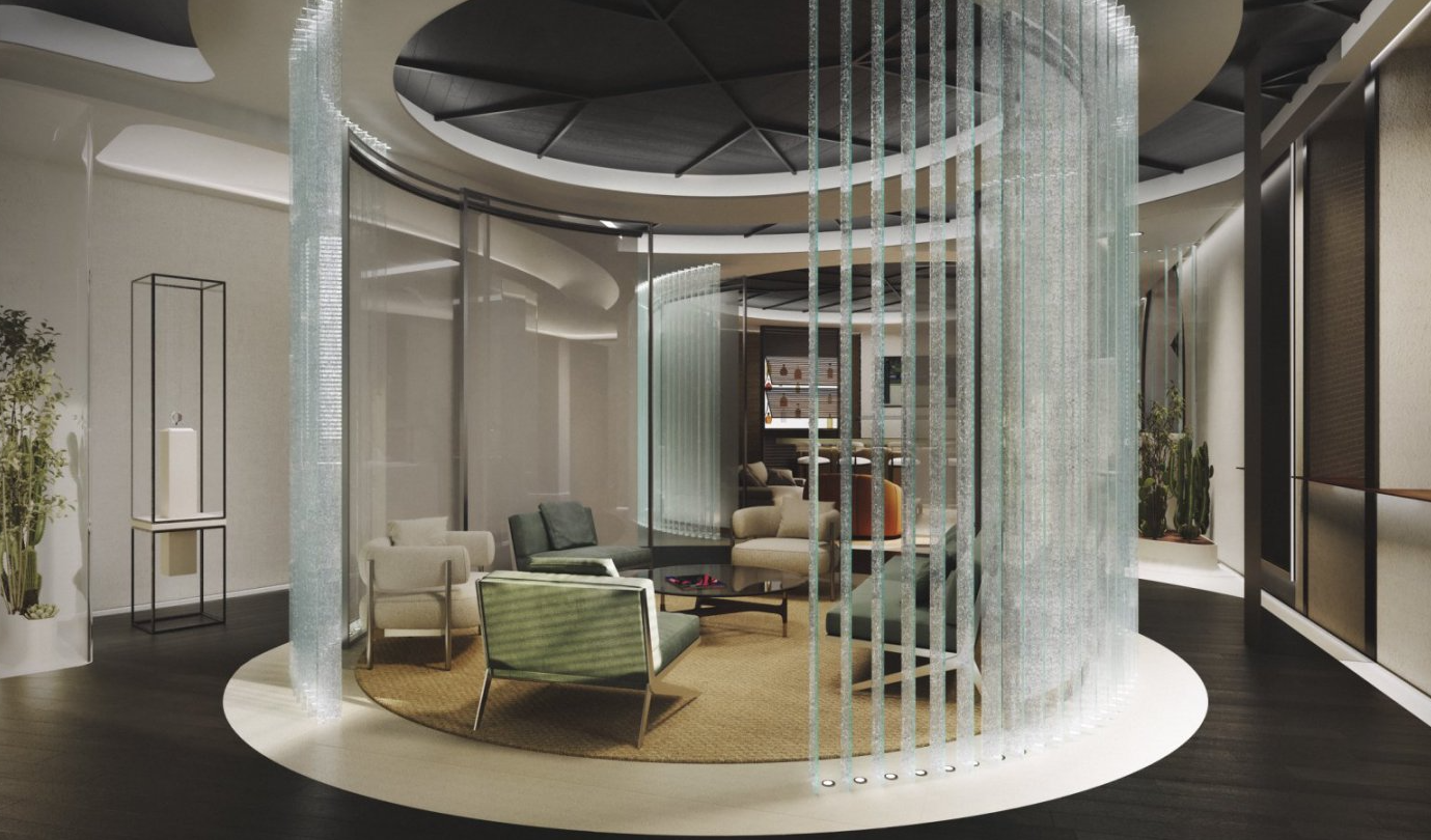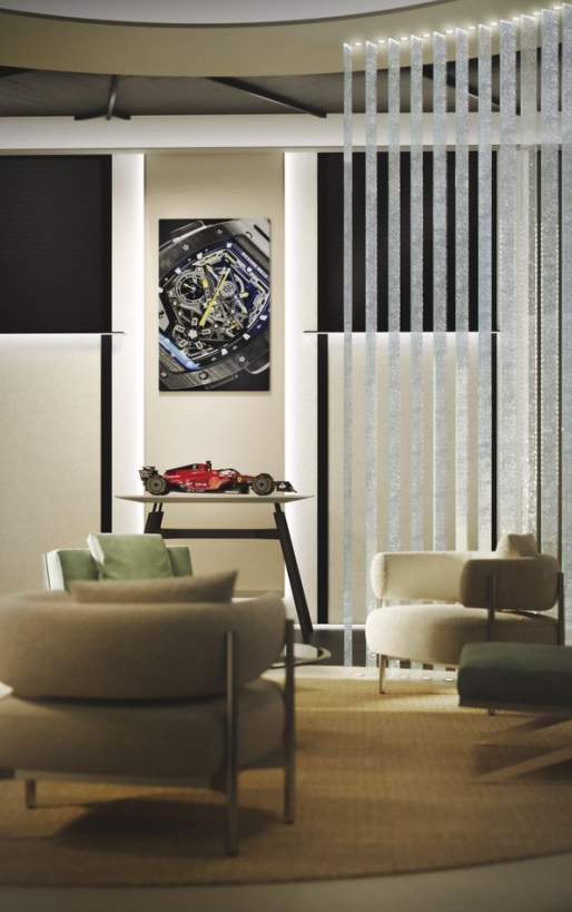 精品店总面积达 270 平方米,空间开阔通透,兼具亲和力与雅致感,让访客可随心漫步、自在探索。店内摒弃传统墙体隔断,转而融入品牌标志性的“碎玻璃”鳍片元素--这一贯穿全球所有 RICHARD MILLE 精品店的建筑元素,既巧妙划分功能分区,又维系视觉通透感,最终构建出兼具空间流动性与私密氛围的通透格局。