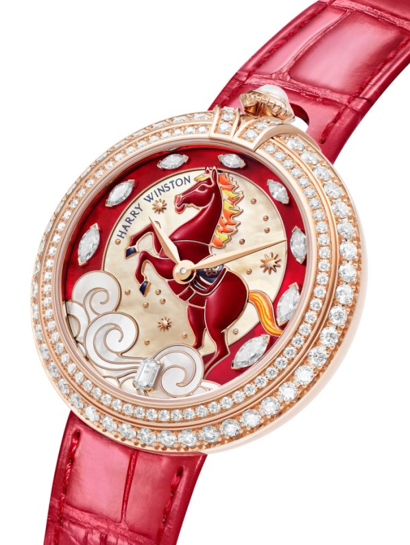 为庆祝中国马年,海瑞温斯顿Moments系列推出一款奢华玫瑰金腕表。表盘上的骏马采用鲜艳的红色漆面,栩栩如生,彰显出中国十二生肖中第七位生肖所象征的独立、力量和冒险精神。作品还致敬了深远的中国文化传统,缀以海瑞温斯顿至美的璀璨钻石,尽显非凡魅力。这款马年主题腕表限量发行8枚,寓意吉祥美满。