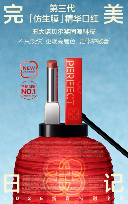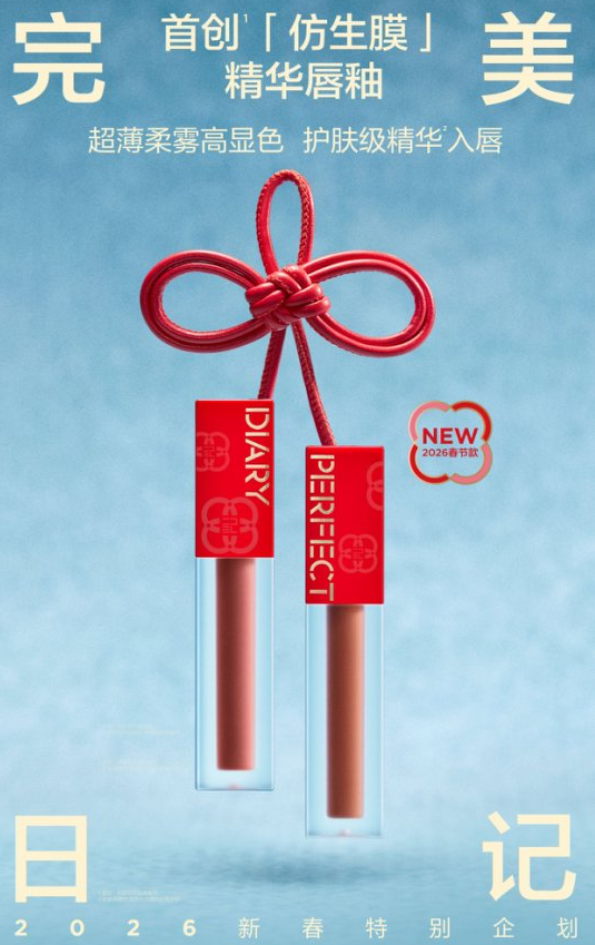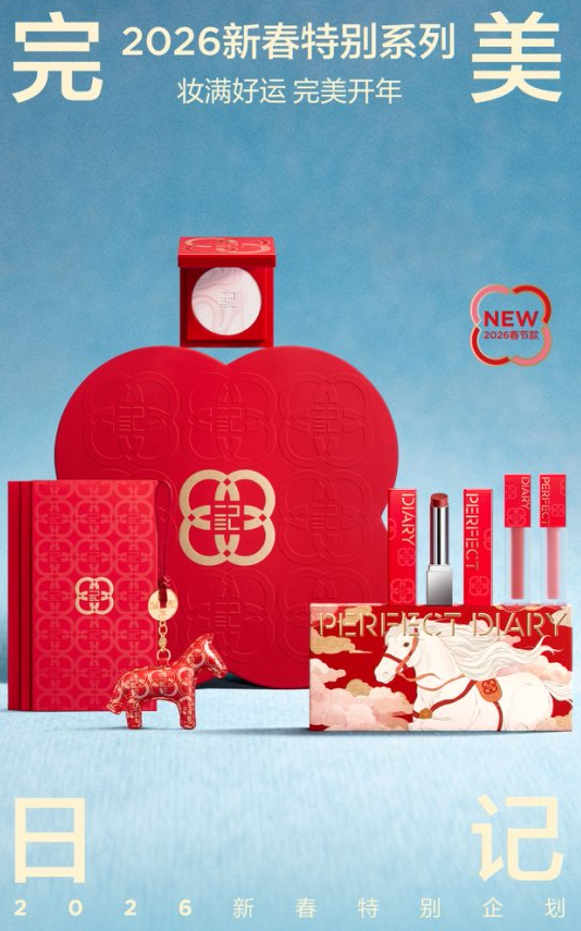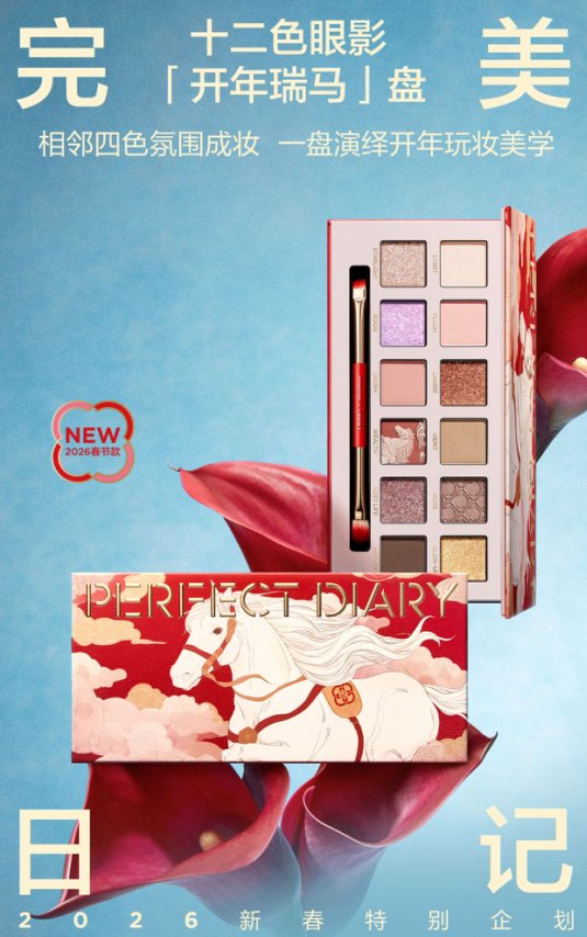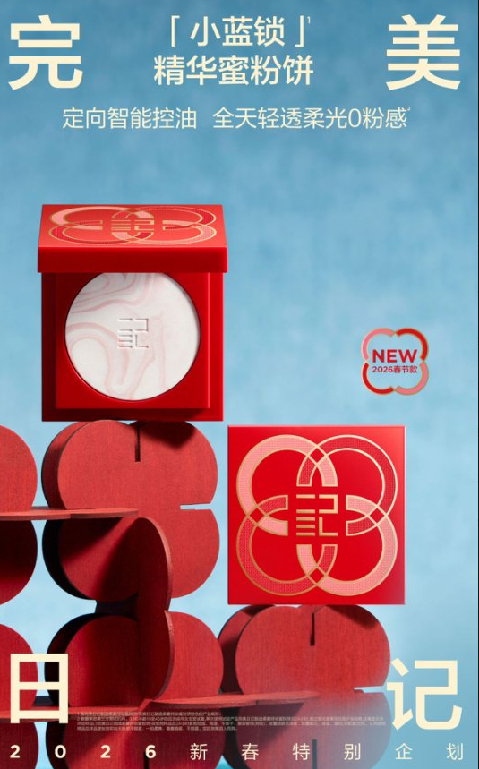 完美日记倾心呈现新春特别系列,该系列包含第三代「仿生膜」精华口红、首创「仿生膜」精华唇釉、「小蓝锁」精华蜜粉饼与探险家十二色眼影「开年瑞马盘」。 本次设计以好运马蹄铁与四合如意纹两种吉祥符号为灵感,巧妙融合前沿科技与传统美学,为新春妆容增添一份惊喜。