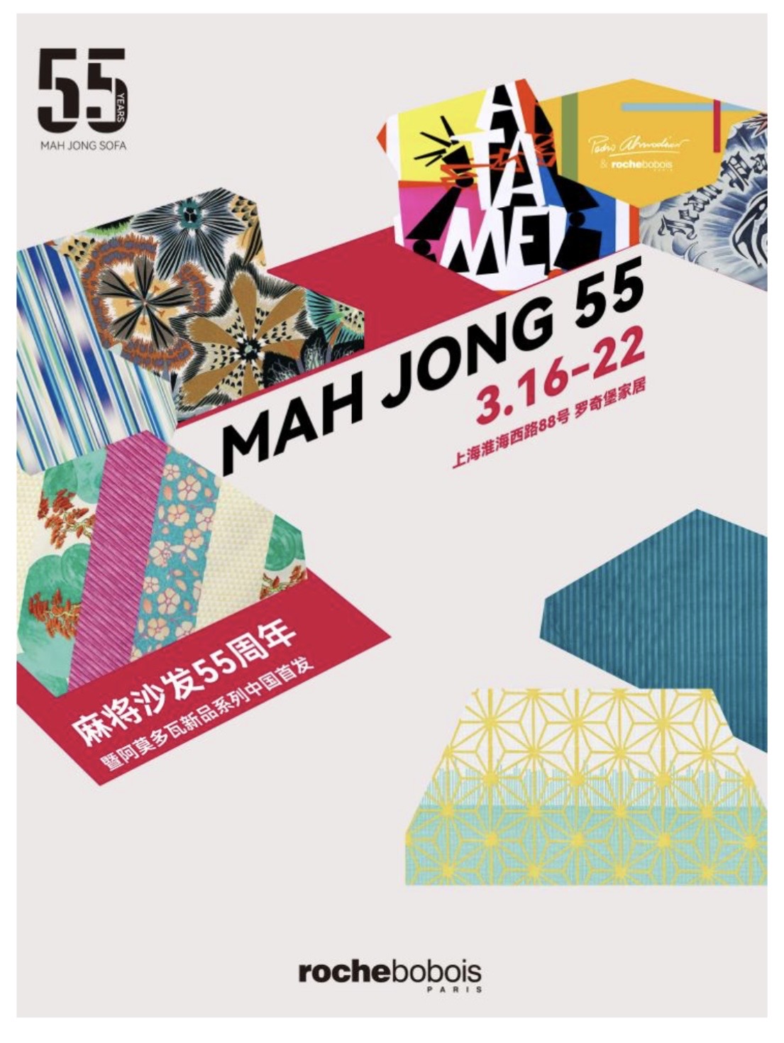 2026年3月16~22日,法国高端家居品牌 Roche Bobois 罗奇堡在上海淮海西路旗舰店开启一场艺术与生活的跨界盛宴。本次活动不仅是品牌传世经典 Mah Jong“麻将”沙发诞生55周年的致敬礼赞,更是与西班牙著名导演 Pedro Almodóvar(佩德罗·阿莫多瓦)联名新品系列在中国市场的首度惊艳亮相。该产品全球限量发行50套,特别复刻了 Mah Jong 的“前身”——Lounge 沙发,作为设计的基底原型,并在其结构之上重现阿莫多瓦独具标志性的图形美学宇宙。